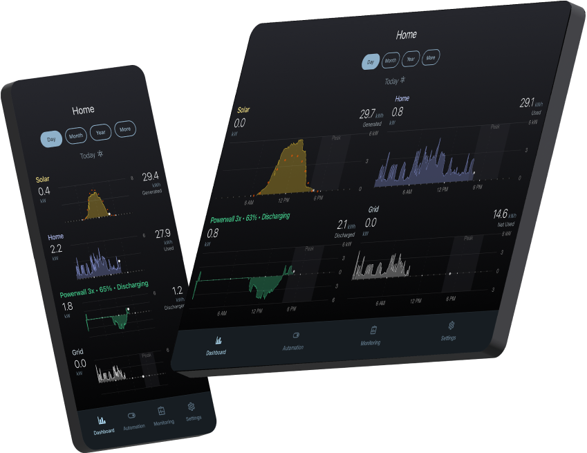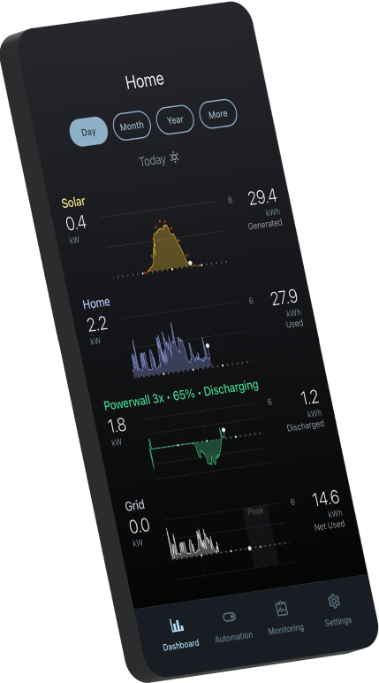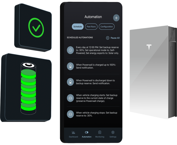 Take charge of your Powerwall. Schedule charging, discharging, and backup settings. Prevent unnecessary discharge during EV charging and improve efficiency. Automate your home energy with device integrations.